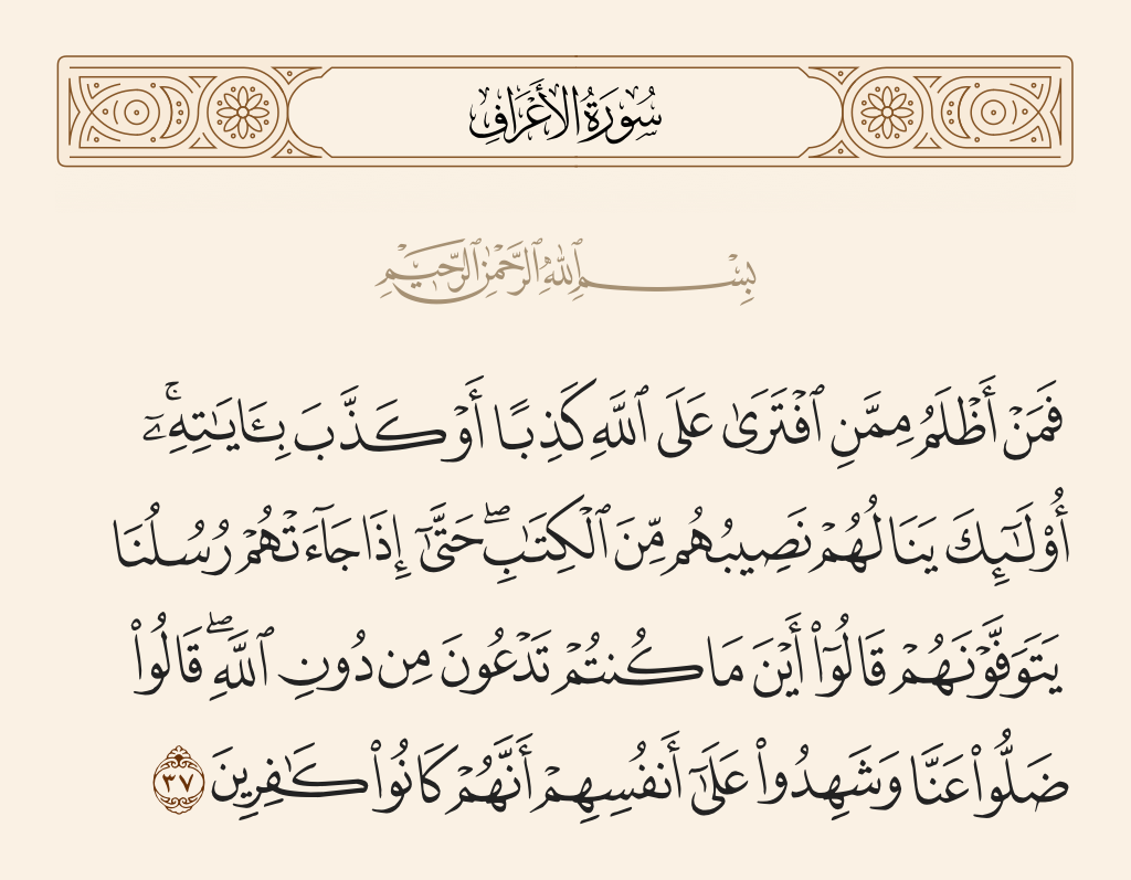 ﴿ فمن أظلم ممن افترى على الله كذبا أو كذب بآياته أولئك ينالهم نصيبهم من الكتاب حتى إذا جاءتهم رسلنا يتوفونهم قالوا أين ما كنتم تدعون من دون الله قالوا ضلوا عنا وشهدوا على أنفسهم أنهم كانوا كافرين ﴾
